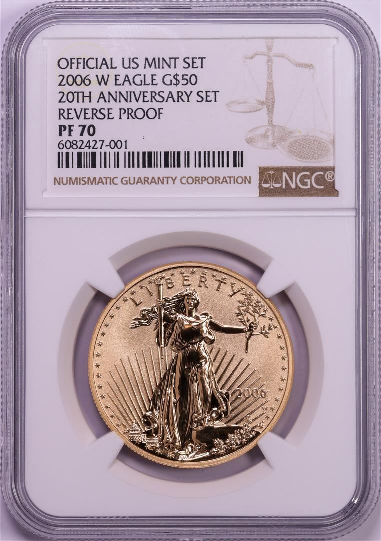 One 2006-W $50 Reverse Proof American Gold Eagle Coin NGC PF70 20th Anniversary. NGC Certified.