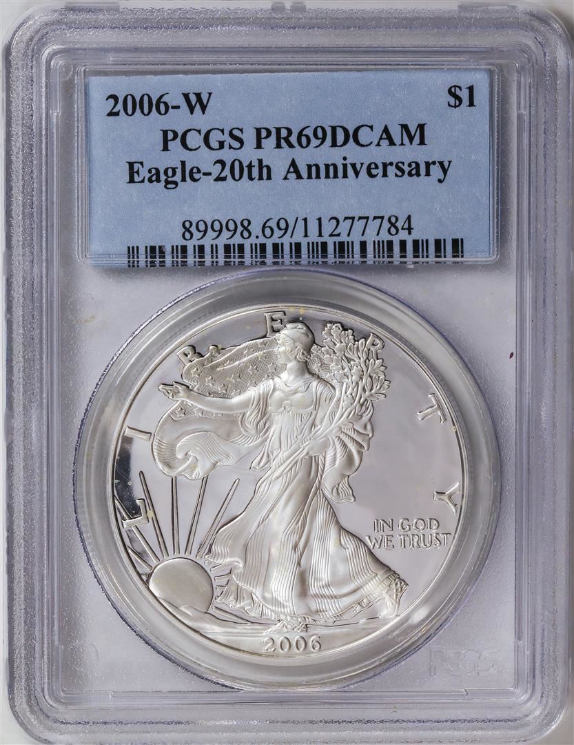 One 2006-W American Silver Eagle .999 Fine Silver Dollar Coin PCGS PR69DCAM.