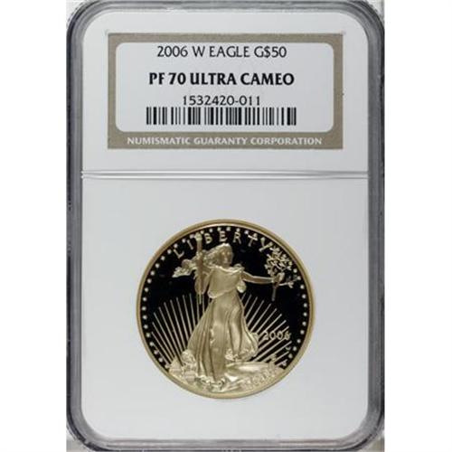 <B>2006-W G$50 One-Ounce Gold PR70 Deep Cameo NGC.</B></I> NGC Census: (0/0). PCGS Population (192/0). Numismedia Wsl. Price for NGC/PCGS coin in PR70: $1,075. (#99988)<BR><BR><b>Shipping:</b> Coins & Currency (<a target="_blank" href="http://www.heritageauctions.com/common/shipping.php">view shipping information</a>)