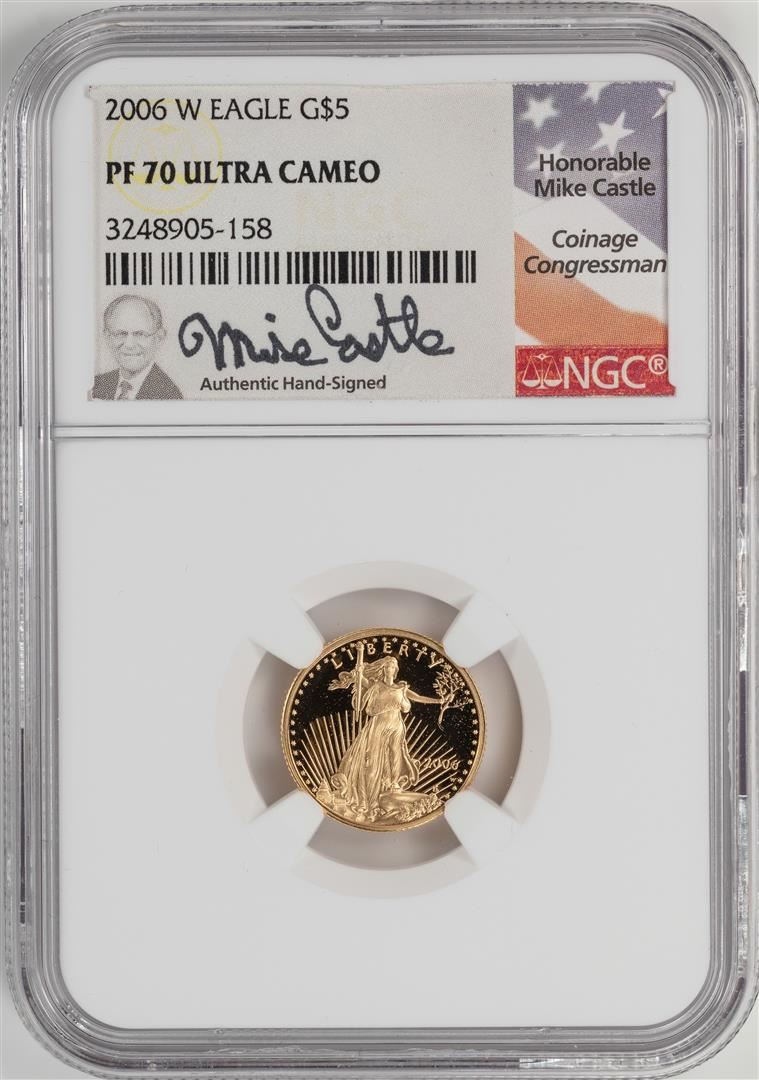 One 2006-W Proof $5 American Gold Eagle Coin NGC PF70 Ultra Cameo Mike Castle Signature. NGC Certified.