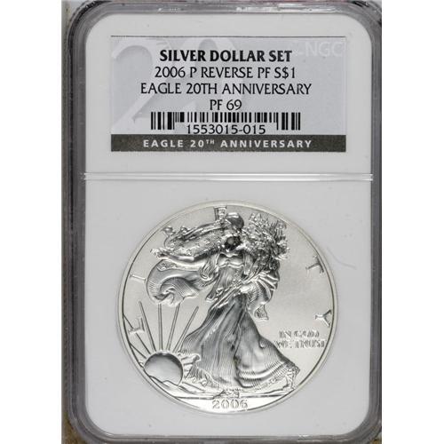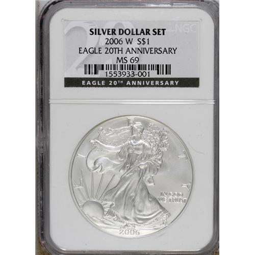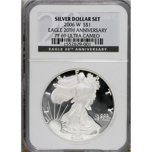 <B>2006-W S$1 PR 69 Ultra Cameo NGC, 2006-P PR69 NGC,</B></I> and a <B>2006-W MS69 NGC.</B></I> 20th Anniversary Silver Eagle Set.<BR><BR><b>Shipping:</b> Coins & Currency (<a target="_blank" href="http://www.heritageauctions.com/common/shipping.php">view shipping information</a>)