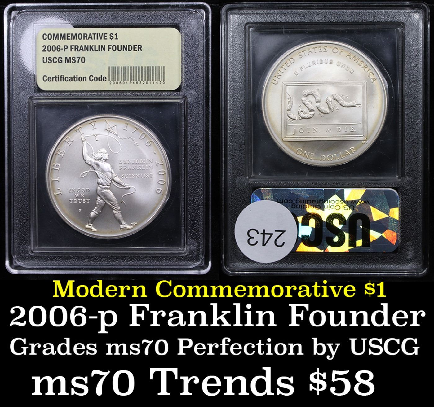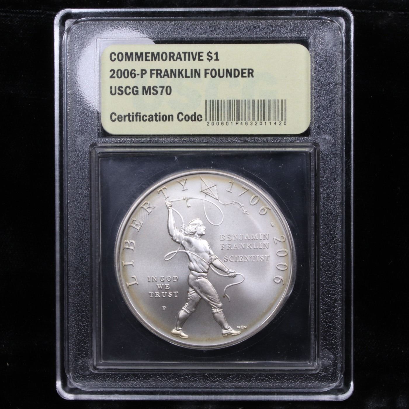 2006-p Ben Franklin Founding Father Modern Commem Dollar $1 Graded ms70, Perfection By USCG. This coin was issued in two varieties. One scientist and one founding father. Both are issued to commemorate the 300th anniversary of Franklin's birth. This coin is the Uncirculated Founding Father Variety, encapsulated and graded ms70 by USCG.