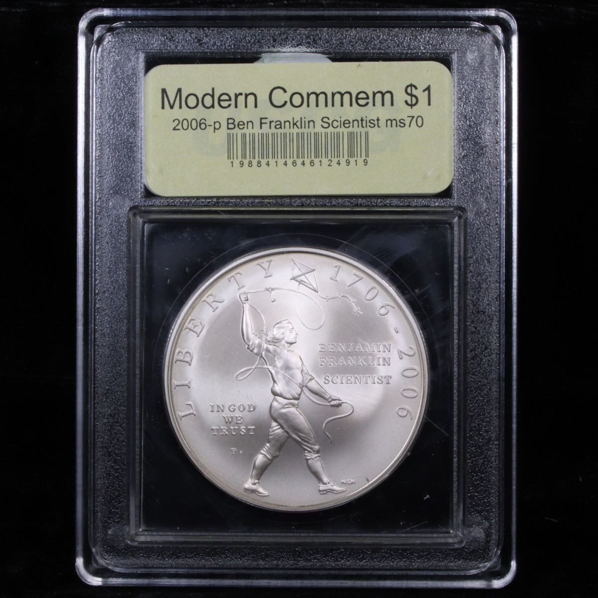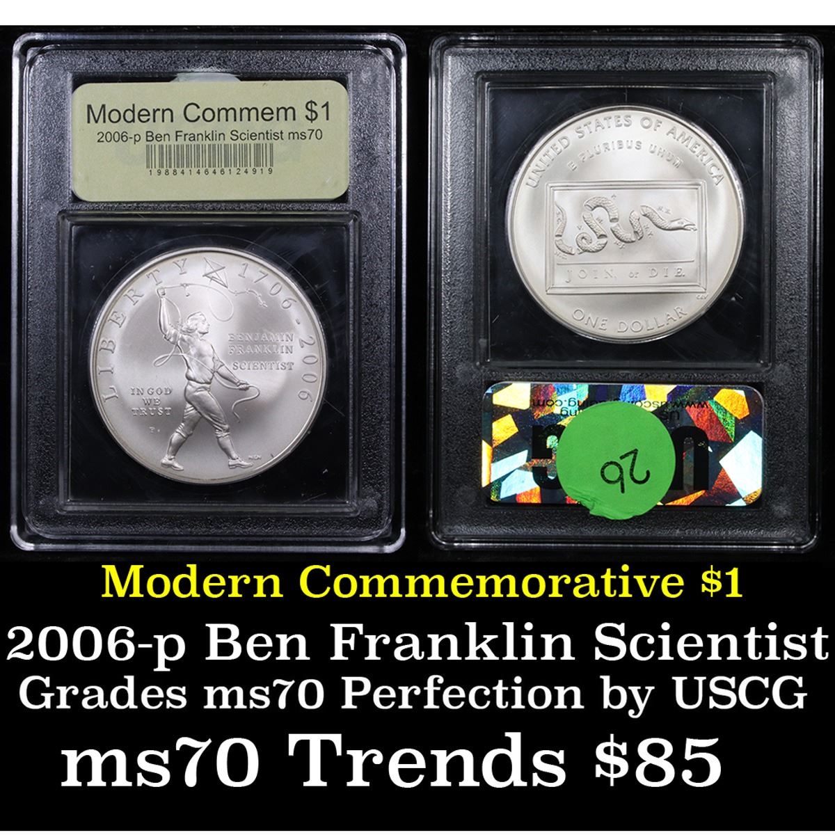 2006-p Ben Franklin Scientist Modern Commem Dollar $1 Graded ms70, Perfection By USCG. This coin was issued in two varieties. One scientist and one founding father. Both are issued to commemorate the 300th anniversary of Franklin's birth. Uncirculated Commemorative Encapsulated and Graded ms70 by USCG.