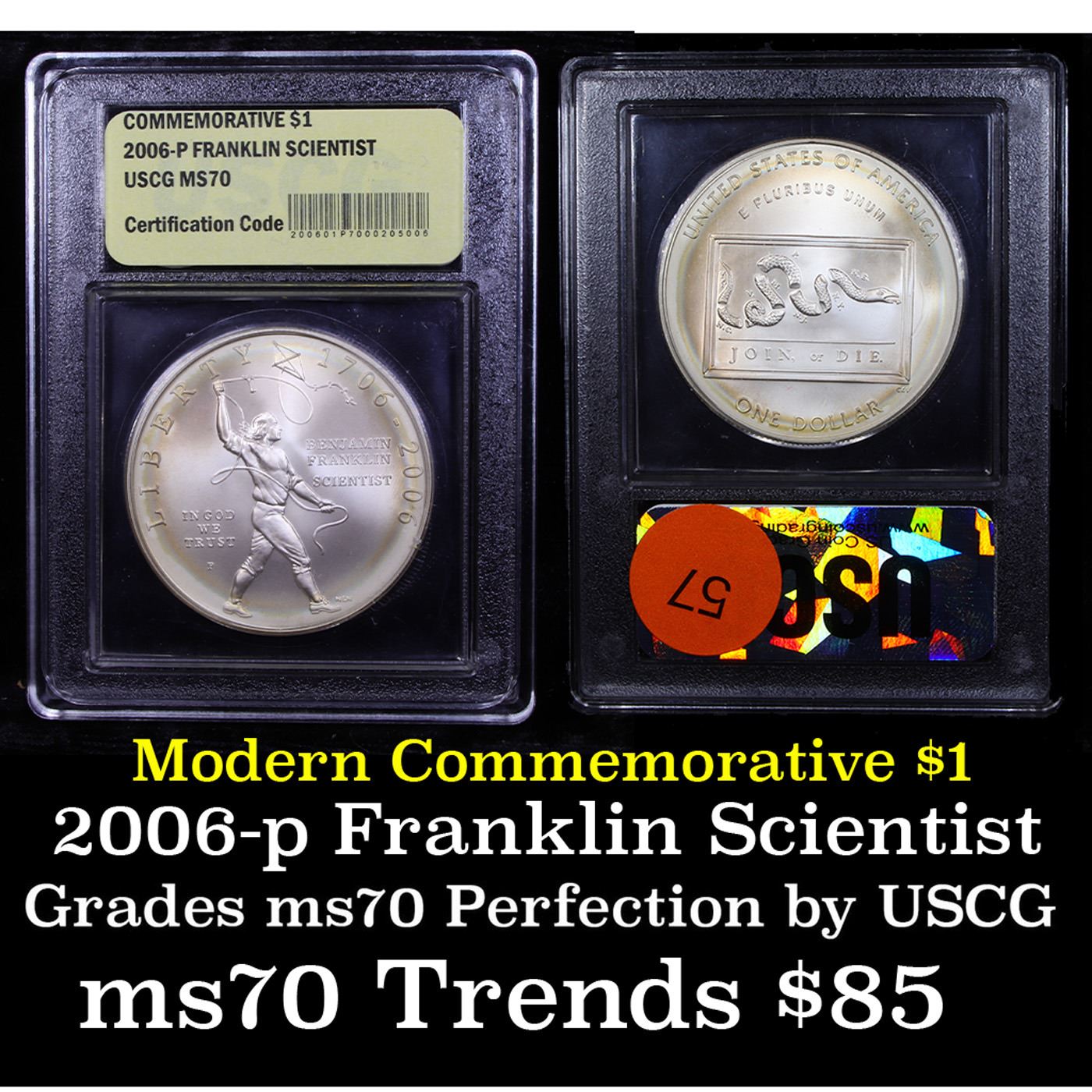 2006-p Ben Franklin Scientist Modern Commem Dollar $1 Graded ms70, Perfection By USCG. This coin was issued in two varieties. One scientist and one founding father. Both are issued to commemorate the 300th birthday of Franklin's birth. Uncirculated Commemorative Encapsulated and Graded ms70 by USCG.