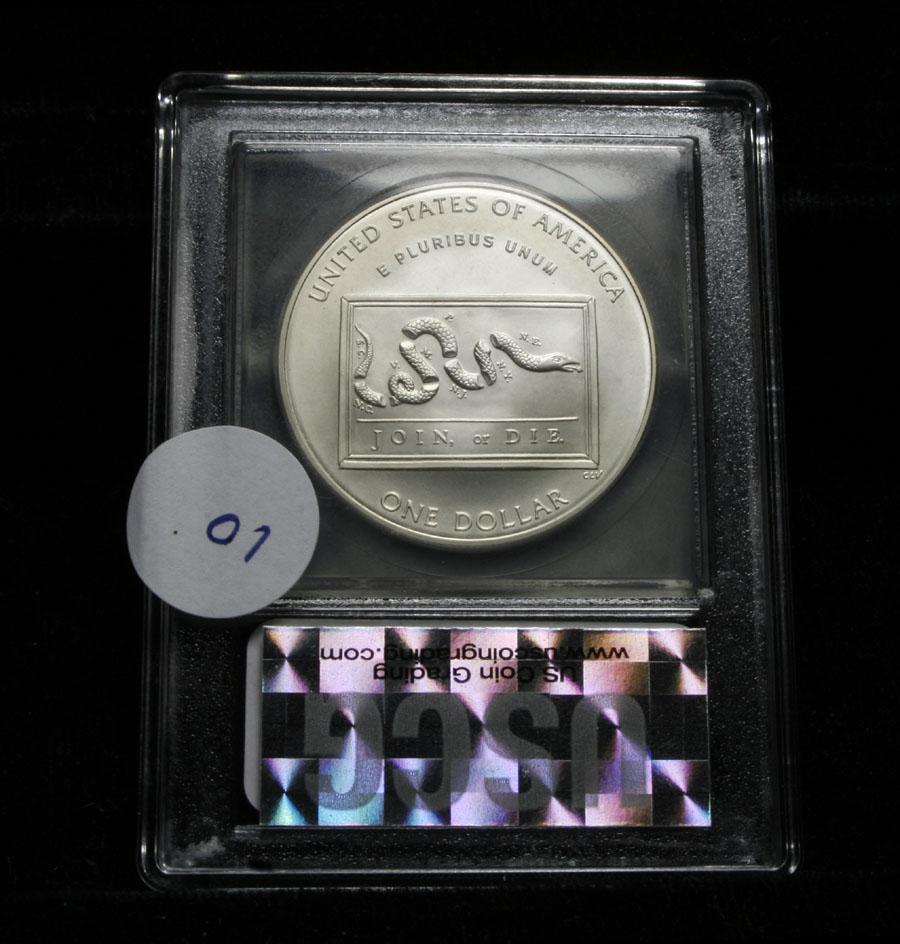This coin was issued in two varieties. One scientist and one founding father. Both are issued to commemorate the 300th birthday of Franklin's birth. Uncirculated Commemorative Encapsulated and Graded ms70 by USCG. PCGS lists ms70 at $550. Estimated Value $150