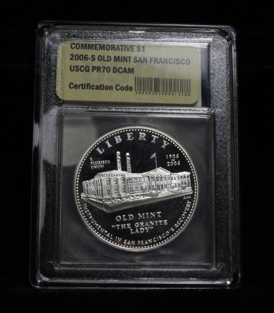 The 2006 Old San Francisco Mint Silver Dollar was issued to mark the centennial of the building's survival of the 1906 earthquake and fire. The so-called "Granite Lady" was also viewed as instrumental in helping the city recover following the disaster. The Reverse is especially significant to Morgan Dollar Collector's as it is a copy of the Morgan Dollar Reverse. Encapsulated and graded PR70 DCAM by USCG. PCGS lists PR70 DCAM at $385 Estimated Value $125