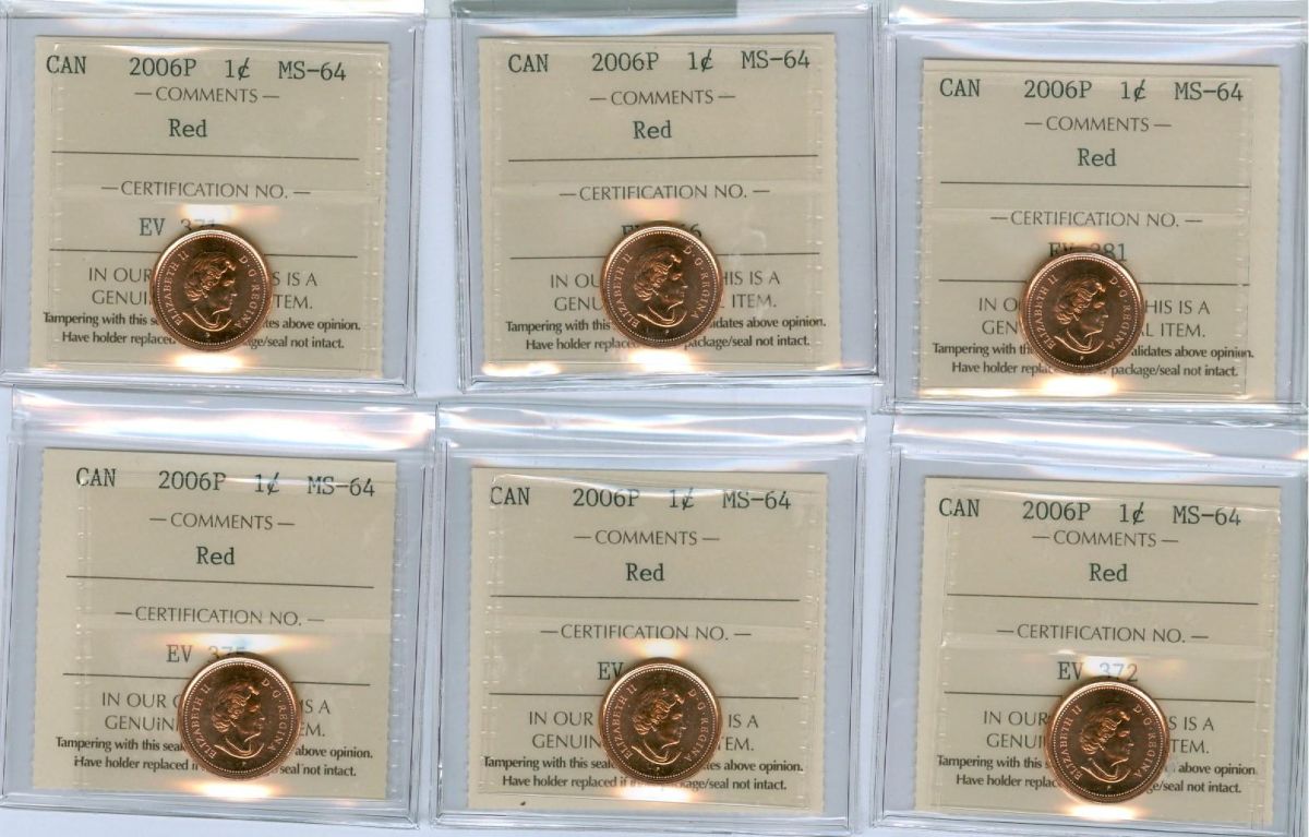 2006P 1¢ ICCS MS64. Lot of 6 coins all red. A difficult issue to find.