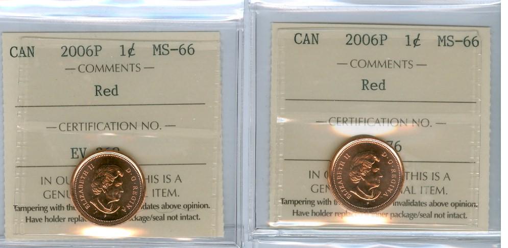 2006P 1¢ ICCS MS66. Lot of 2 coins both full red. A difficult issue to find.