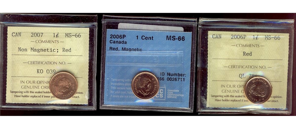 2006P 1¢ Magn MS66 & 2007 Non Magn both ICCS MS66RD. Includes 2nd 2006P Magn CCCS MS66RD. Lot of 3 coins.