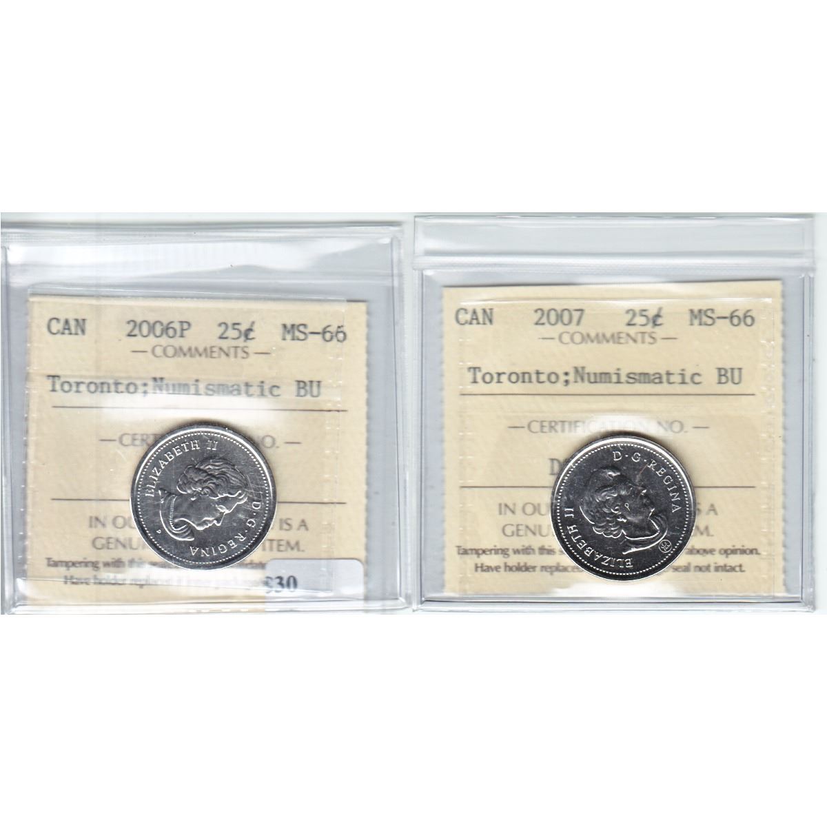 2006P & 2007 Coloured Toronto Maple Leaf 25ct ICCS Certified MS-66 NBU. Buyers Premium will be added on all items as per our terms of sale. We accept Paypal, Credit Card, E-Transfer Payments, Cheque or Money Orders (there is an additional 3% fee for using Paypal or Credit Card). All invoices will be emailed immediately following the auction, please contact us if you would like to pay by credit card or receive a new revised lower total for mailing in payment or sending an e-transfer (3% discount). All Items Are Sold "AS IS", no returns
