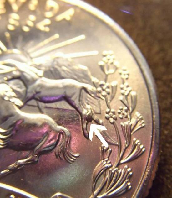 SUPER RARE die error caused by a chip in the die leaving extra metal which looks like the horse pooped on its rear legs; this could be the next Wisconsin leaf in popularity; choice BU
