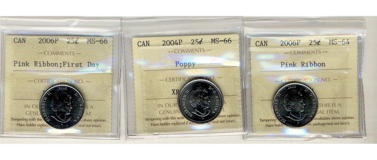 2006P Pink Ribbon MS64, 2006P Pink Ribbon, 2004P Poppy 25 Cents MS66; Three ICCS coins.