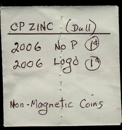 2006P and 2006 No P 1¢. Lot of two coins includes magnetic 2006P and Zinc 2006 No P. Both UNC.