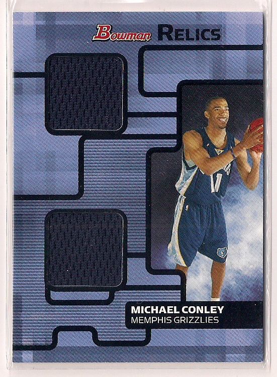 2007-08 Bowman Draft Picks & Stars Relics Michael Conley Dual Player-Worn Material Insert Card. This Insert featues Dual Solid Blue pieces of Player-Worn Material, and is serial numbered 027/199! Card is Near Mint.