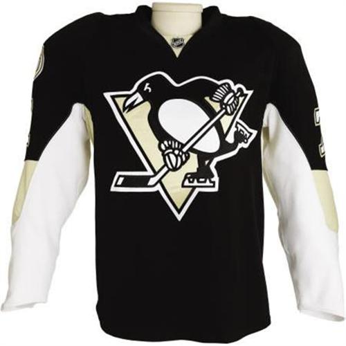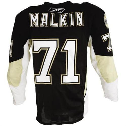 <B>2007-08 Evgeni Malkin Game Worn Jersey.</B></I> Part of a powerful young Russian contingent that includes Alexander Ovechkin, Evgeni Malkin is already one of the most exciting and prolific scorers in the league today. Malkin was the number 2 overall draft in the 2004 NHL Entry Draft, but disputes with the Russian Hockey Federation delayed his NHL debut until 2006. His arrival to the league came with a bang, and he won the Calder Trophy for Rookie of the Year in his first season with the Pittsburgh Penguins. From the current season, which at the time of this writing sees him atop the scoring race with only Ovechkin ahead of him, we present this home black jersey in the new Reebok style debuted last year. The Pittsburgh team logo occupies the chest, while "MALKIN" and "71" are applied to the verso in three-color white, black and gold tackle twill. Wear is light, but evident. Right shoulder includes patch honoring the 250th anniversary of the founding of Pittsburgh. Tail includes "2007-08 set #2" tagging from Cutting Edge Sports and includes the name of equipment manager "Dana Heinze". Heinze has also signed the affixed fight strap. A stellar find from one the game's most-promising stars. <I>Includes team letter from the Pittsburgh Penguins.</B></I><BR><BR><b>Shipping:</b> Clothing, Costumes & Jerseys (<a target="_blank" href="http://www.heritageauctions.com/common/shipping.php">view shipping information</a>)