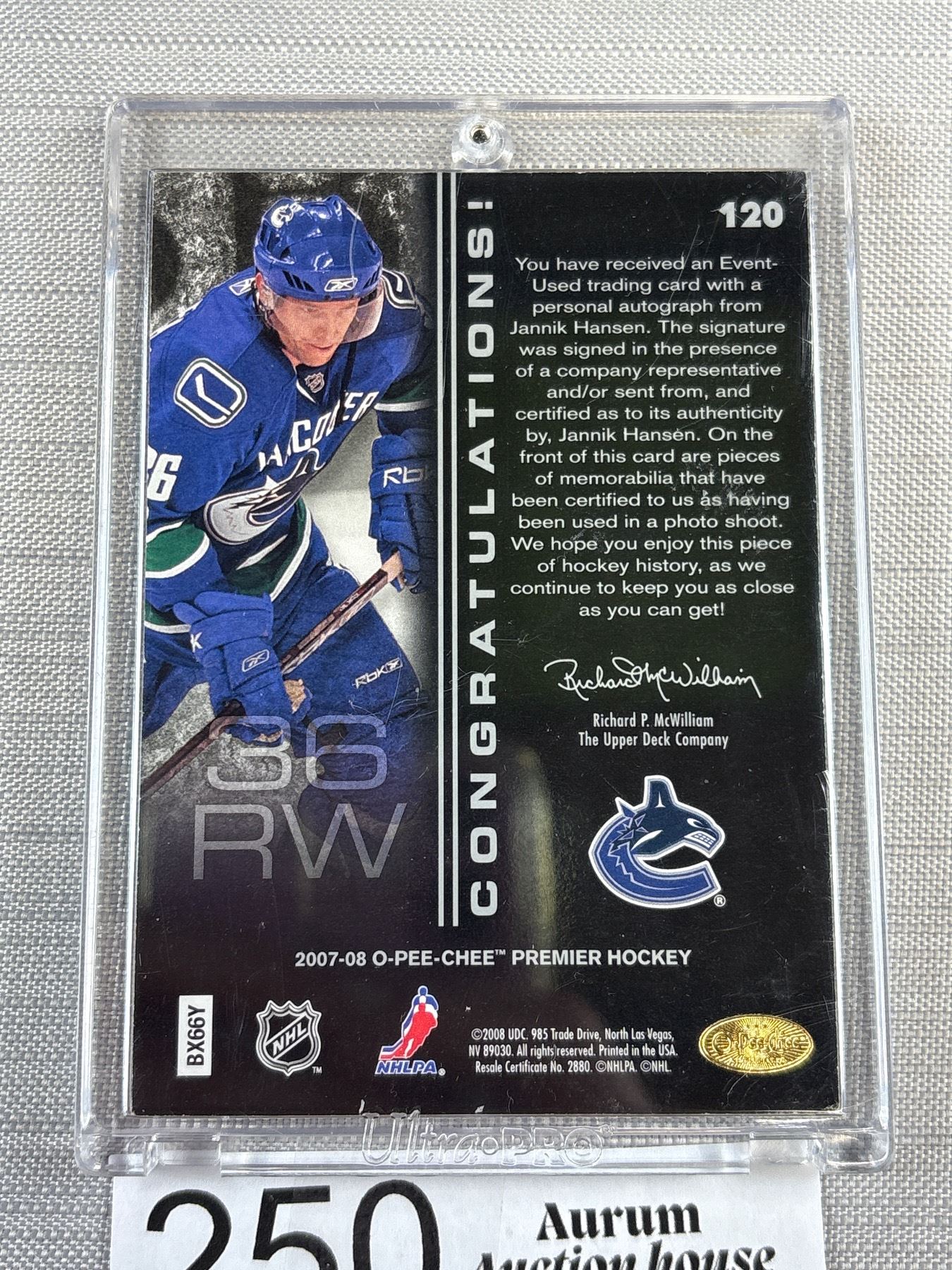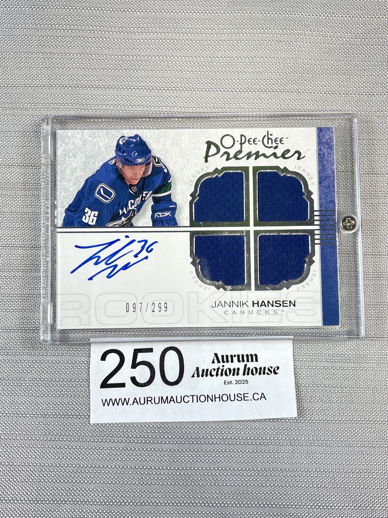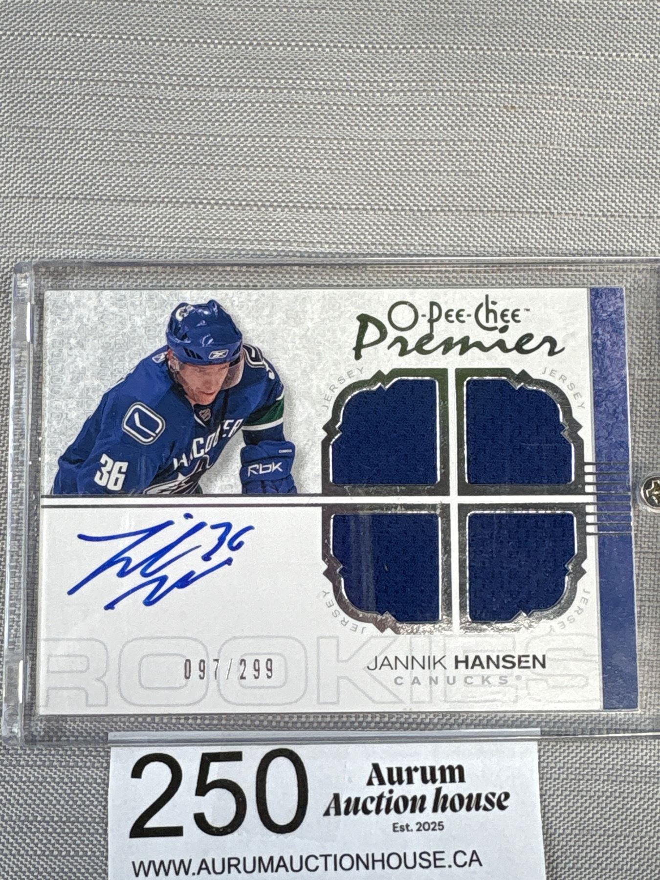 2007-08 OPC Premier Ltd Ed Quad Patch Auto Jersey Rookie Card Jannik Hansen Vancouver Canucks 097/299