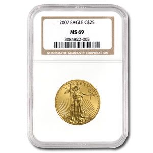 2007 1/2 oz Gold American Eagle MS-69 NGC **|**|** 2007 1/2 oz Gold American Eagle MS-69 NGCYear ***2007Grade***MS-69Denomination**50Dim.**32.7Thick:**2.87mm ; MSRP: $2800