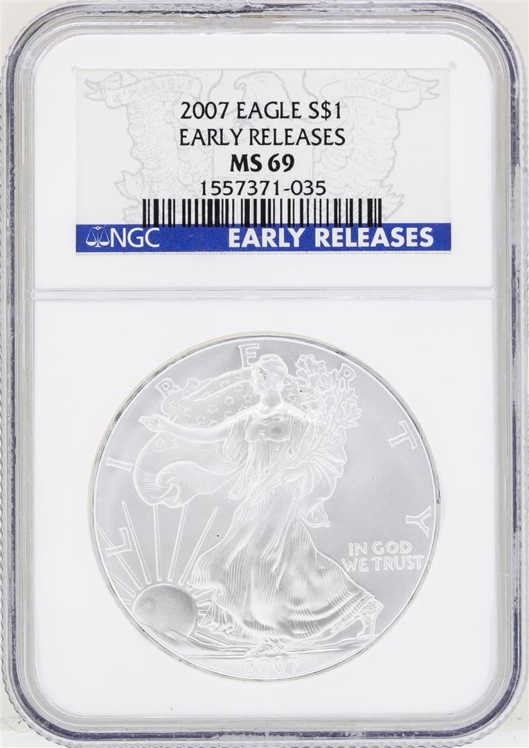 One 2007 $1 American Silver Eagle Coin NGC MS69 Early Releases. NGC Certified.