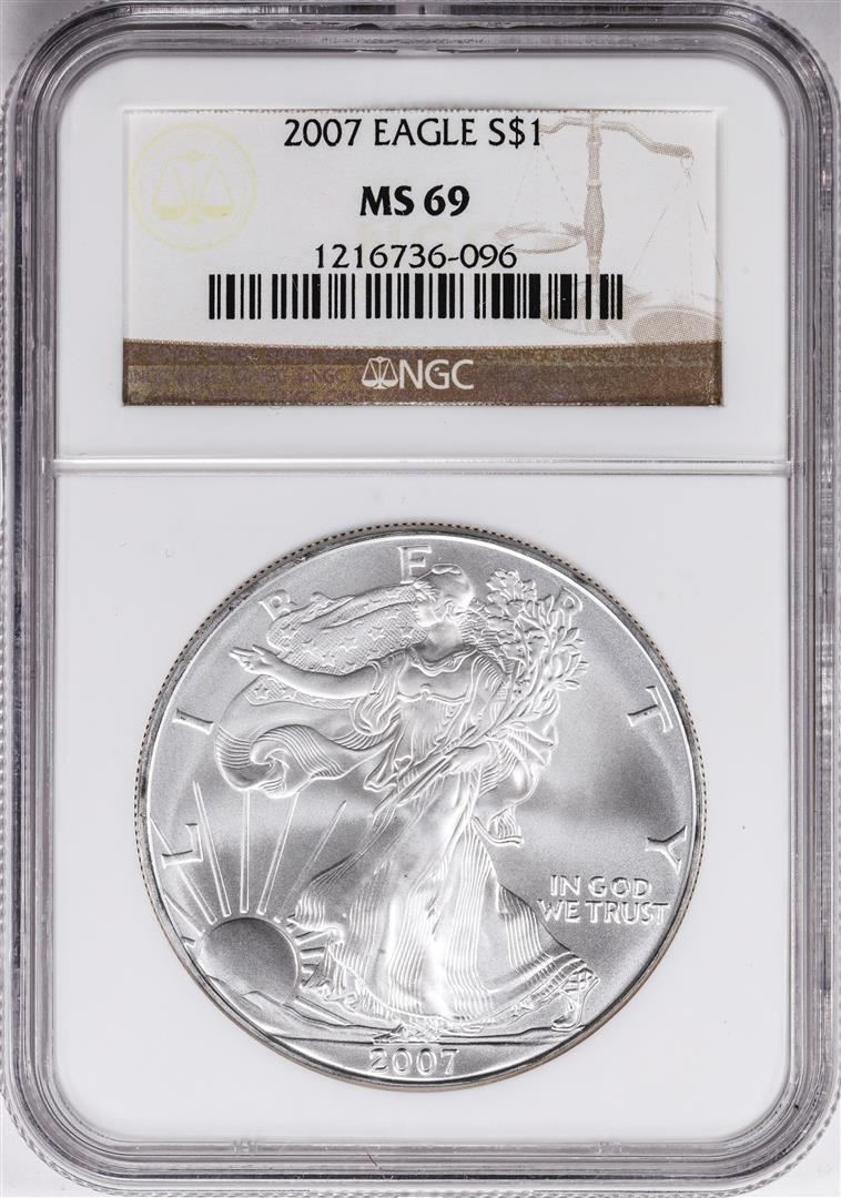 One 2007 $1 American Silver Eagle Coin NGC MS69. NGC Certified.