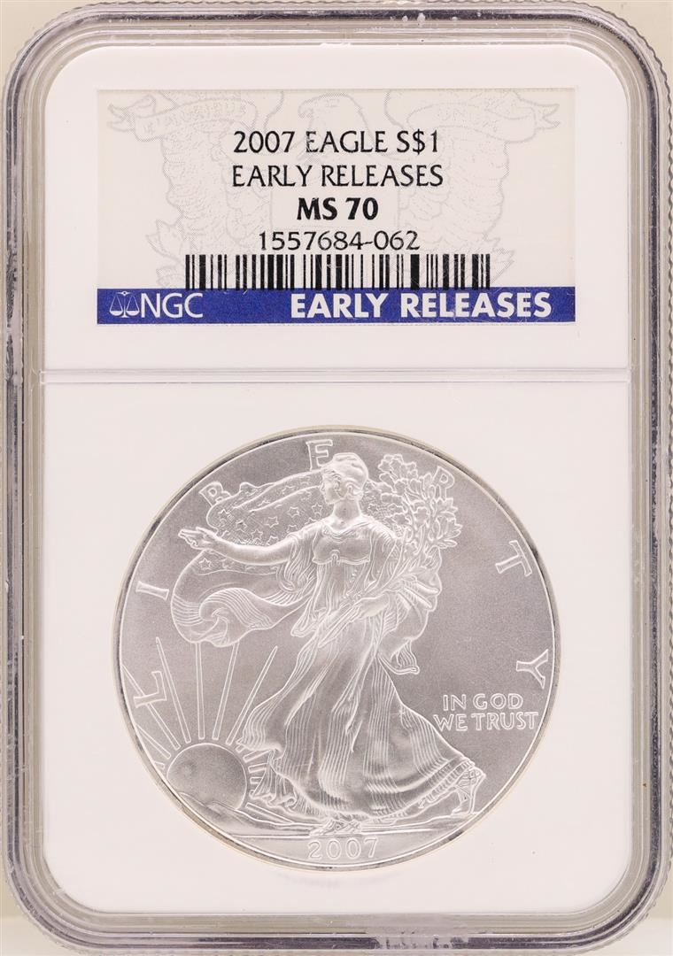 One 2007 $1 American Silver Eagle Coin NGC MS70 Early Releases. NGC Certified.
