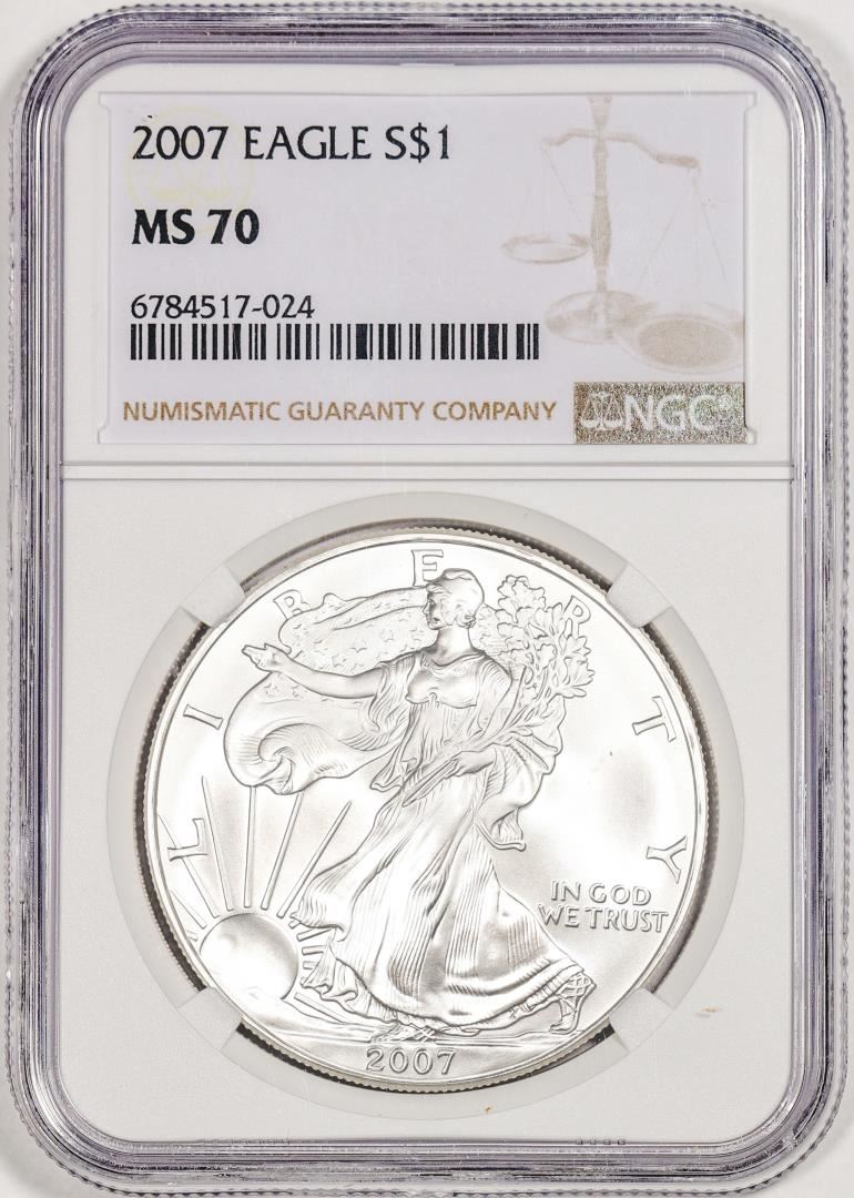 One 2007 $1 American Silver Eagle Coin NGC MS70. NGC Certified.