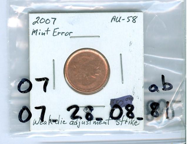 2007 1¢ ERROR, BU obverse with extreme weak strike on the re