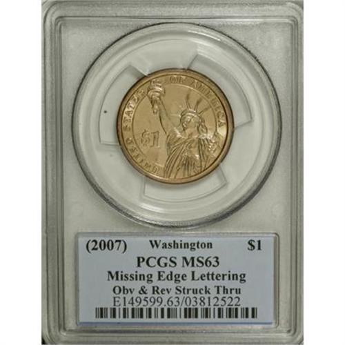<B>(2007) $1 George Washington Missing Edge Lettering, Obverse and Reverse Struck Thru MS63 PCGS.</B></I> . PCGS Population (286/18811). NGC Census: (0/0). Numismedia Wsl. Price for NGC/PCGS coin in MS63: $85. (#149317)<BR><BR><b>Shipping:</b> Coins & Currency (<a target="_blank" href="http://www.heritageauctions.com/common/shipping.php">view shipping information</a>)