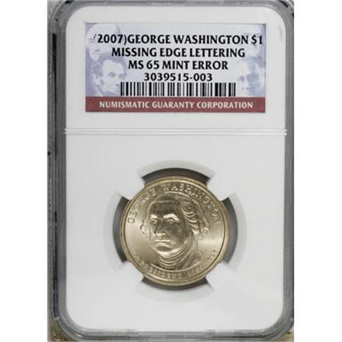 <B>2007 $1 George Washington--Missing Edge Lettering--MS65 NGC.</B></I><BR><BR><b>Shipping:</b> Coins & Currency (<a target="_blank" href="http://www.heritageauctions.com/common/shipping.php">view shipping information</a>)