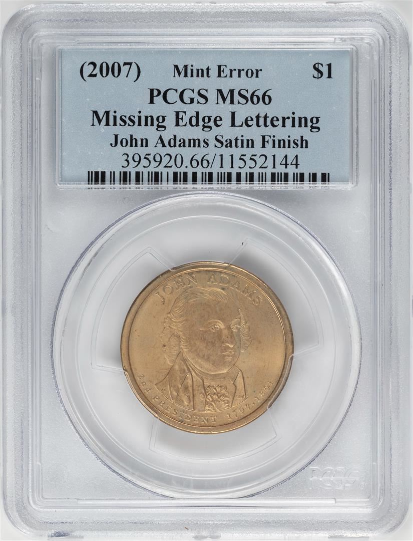 One 2007 $1 John Adams Presidential Coin Missing Edge Lettering Mint Error PCGS MS66. PCGS Graded.