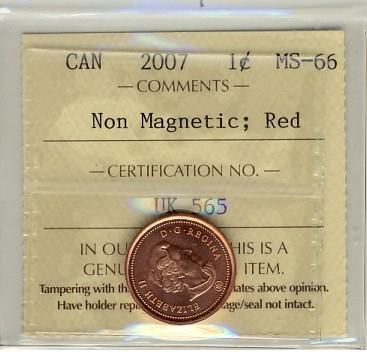 2007 1¢ Non-Magnetic ICCS MS66. Top graded by ICCS standards.