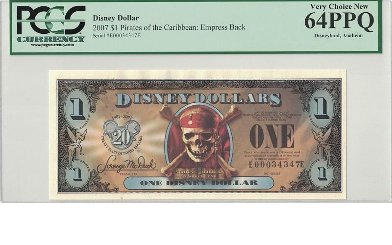 One 2007 $1 Pirates Disney Dollar PCGS 64PPQ.