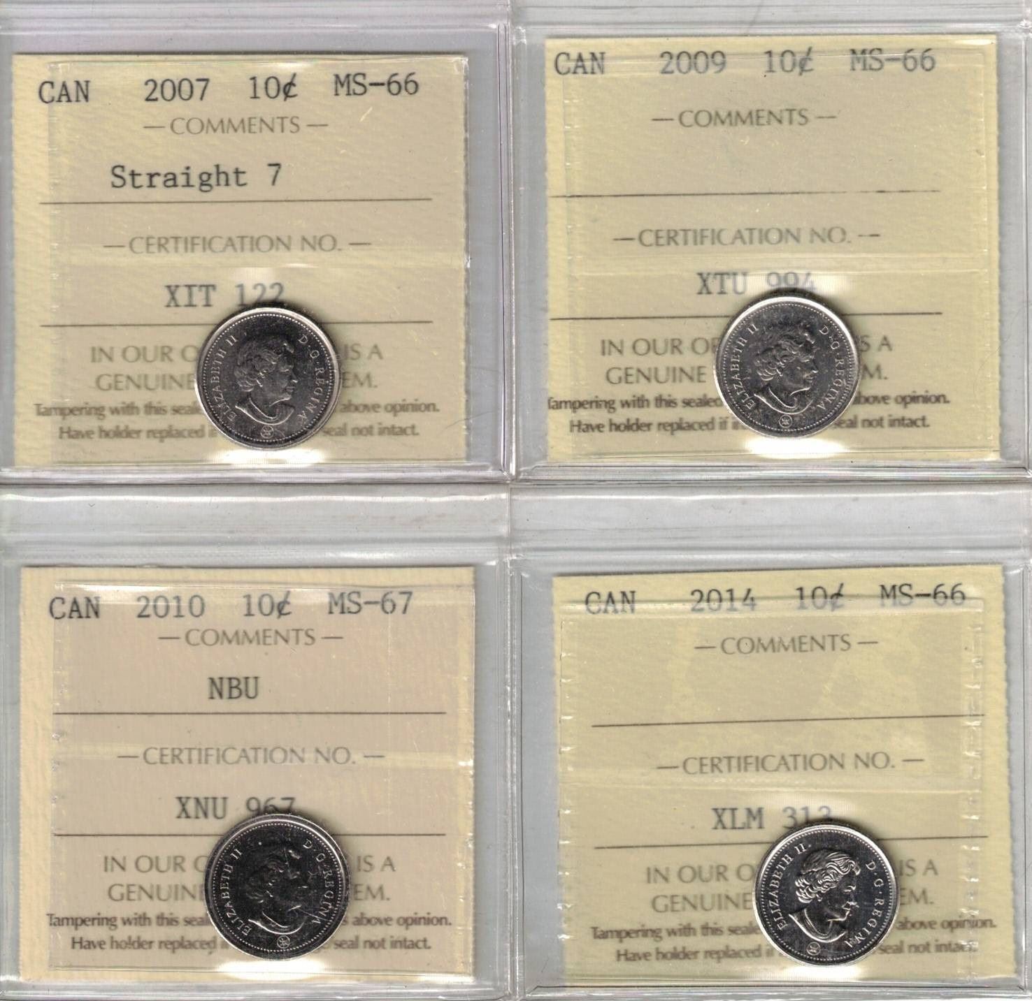 2007 10¢ St7 MS66, 2009 10¢ MS66, 2010 10¢ MS67 NBU, 2014 10¢ MS66, 4pcs All ICCS