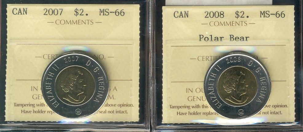 2007 $2 & 2008 Polar Bear ICCS MS66. Lot of 2 coins.