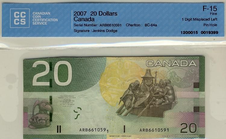 2007 $20 BC-64a, ERROR, 1 Misplaced Digit. CCCS F15, pinhole.