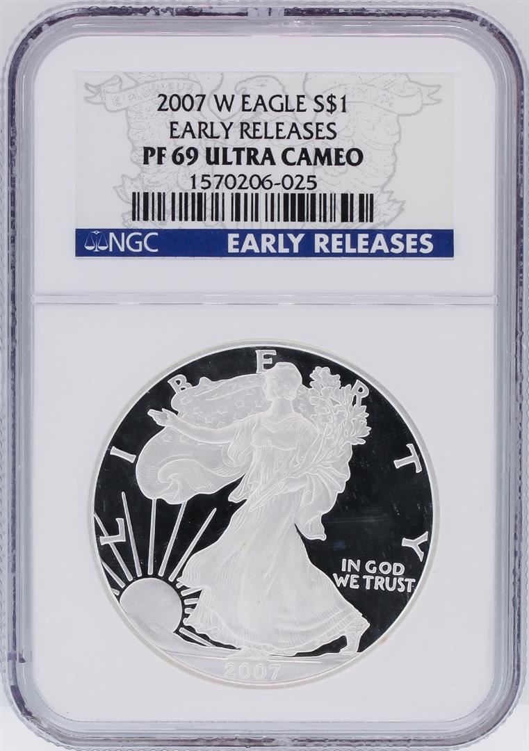 One American Silver Eagle Dollar Coin Set (lot of 2) featuring: 2007 NGC MS69 American Silver Eagle Dollar and 2007-W NGC PF69 Ultra Cameo Early Releases American Silver Eagle Dollar. NGC Certified.