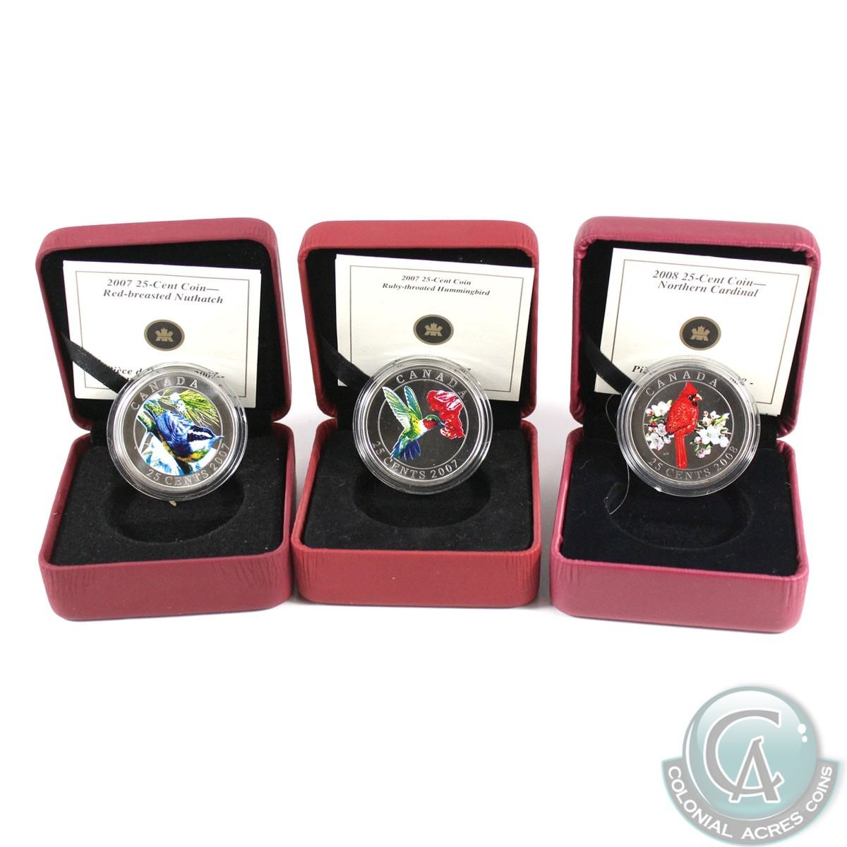 2007-2008 Canada 25-cent Coloured Birds of Canada. You will receive the 2007 Red-breasted Nuthatch, 2007 Ruby-throated Hummingbird, and 2008 Northern Cardinal. Coins come encapsulated in original RCM clamshell cases with COAs. 3pcs