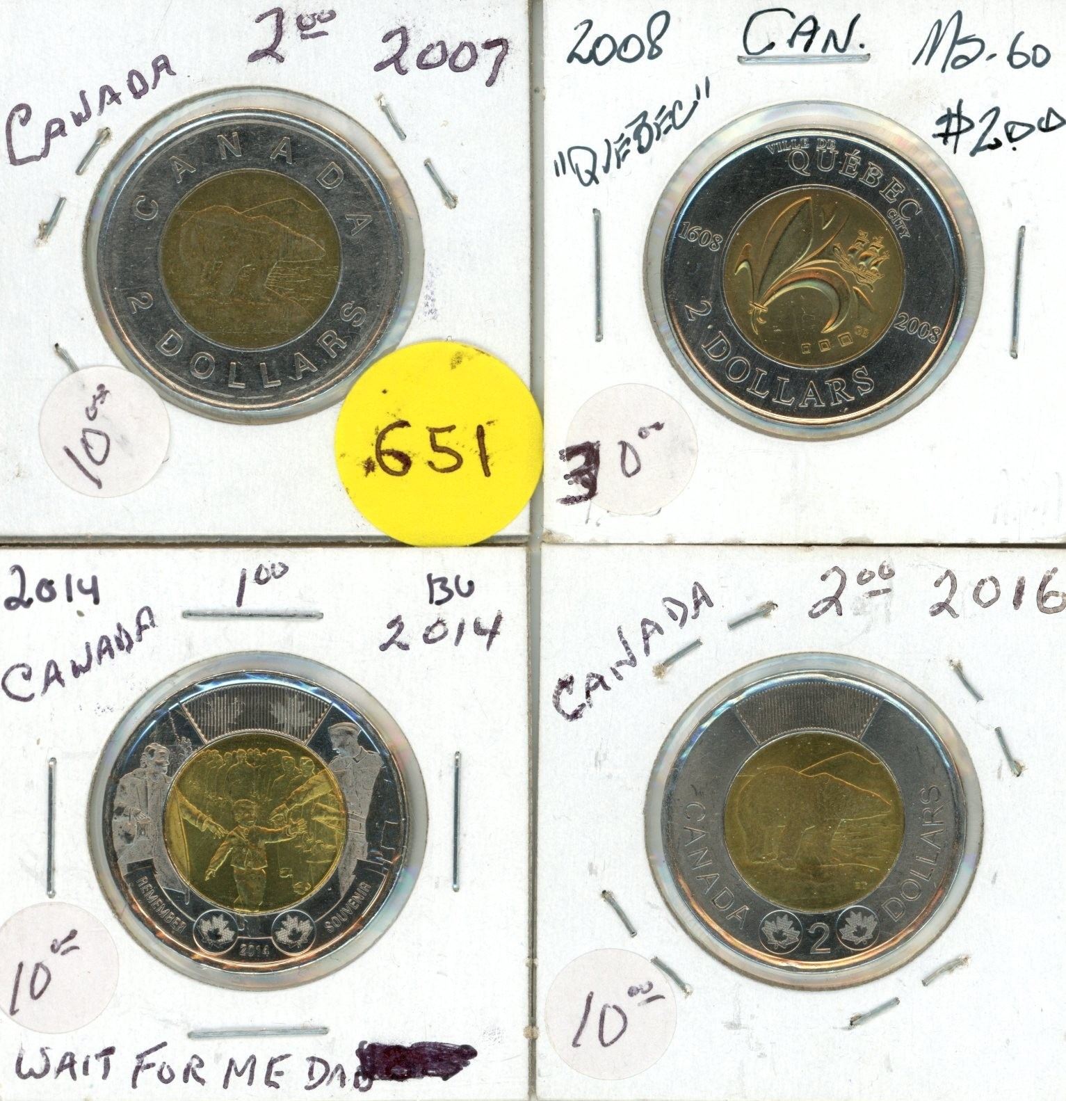 2007, 2008 (Quebec), 2014 (Wait for Me Dady), 2016 Canadian Two Dollar.