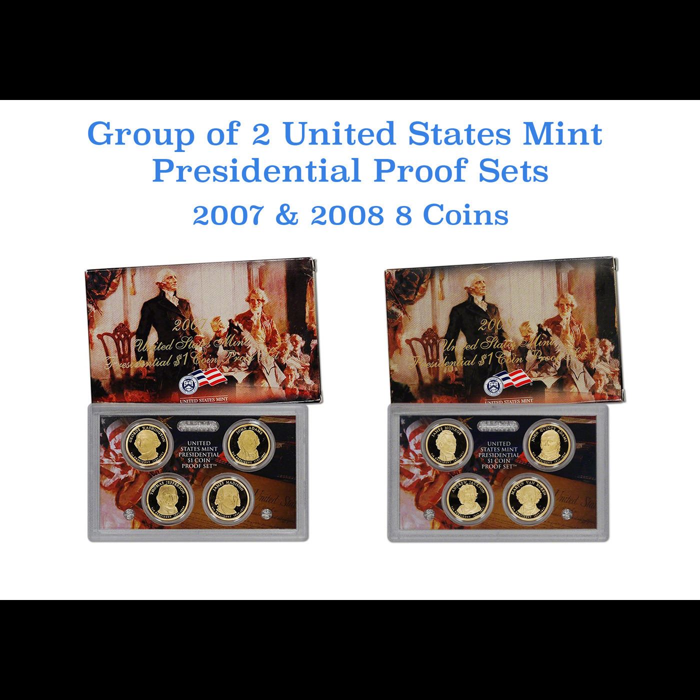 2007-2008 United State Mint Presidential Dollar Proof Set. 8 Coins Inside.. Group of 2 United State Mint Presidential Dollar Proof Set 2007-2008 8 coins, each set includes proof versions of the general circulating $1 Presidential Dollars. 2007 Set start with George Washington, John Adams, Thomas Jefferson, James Madison. 2008 Set include Benjamin Harrison, John Tyler, James Polk and Zachary Taylor. The Presidential $1 Coin Program, launched in 2007, pays tribute to the Presidents of the United States in the order in which they served. These proof coins are struck multiple times with specially polished dies to create a brilliant, sharp relief and mirror–like background. Their frosted, sculpted foregrounds give them a special “cameo” effect. Each coin bears the “S” mint mark representing production at the United States Mint at San Francisco. Set comes in original mint packaging, including COA, a protective hard plastic case and an outer box.