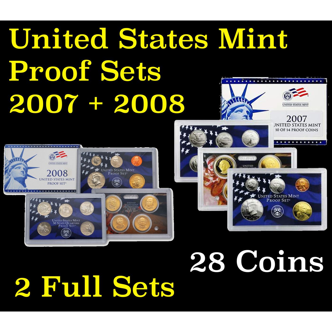 2007 & 2008 United States Mint Proof Sets - 28 Pieces. Many people ask why the 2008 set is so much higher priced than the other near dates. It had a slightly lower mintage, but not drastically. The answer is, the mint shut down sales of the set in June, 5 months earlier than usual and although the mintage of 1.5 million pieces seems near par with the 2-3 million pieces of other near dates, with the mint shutting down sales and many folks who were collecting the whole series, (this was the final piece to the 50 state quarter series) getting shut out, they immediately went to the secondary market. But most of the 1.5 million sold by the mint went to collectors who bought them to keep and did not sell them into the secondary market. So you basically had a shortage of about 1/2 to 1 million sets below demand. The Set contains 4 Proof Presidential Dollars, 5 Proof State Quarters, a Proof Kennedy Half Dollar, a Proof Roosevelt Dime, as well as 3 additional Proof coins Including the Sacagawea Proof Dollar coin. This set includes One example each of the Lincoln Cent, Jefferson Nickel, Roosevelt Dime, Kennedy Half Dollar, Sacagawea "Golden" Dollar, Montana Quarter, Washington Quarter, Idaho Quarter, Wyoming Quarter, and Utah Quarter (all Copper-Nickel Clad). It also includes the first four Presidential Dollars: Washington, Adams, Jefferson, and Madison (Copper-Nickel Clad). Complete with Original Packaging and COA.