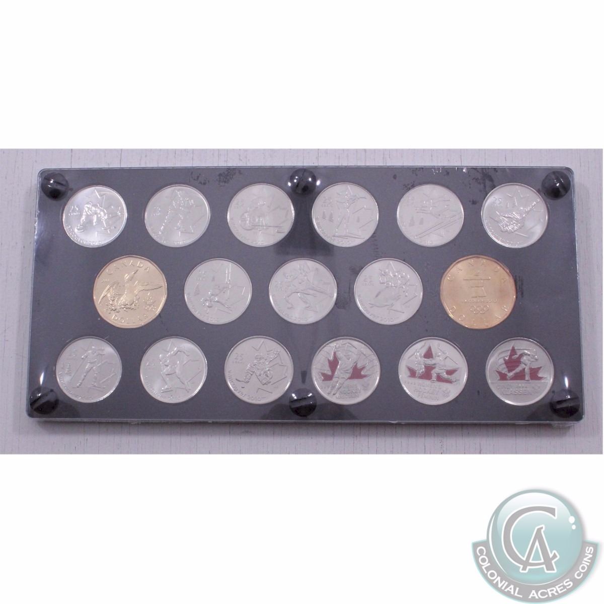 2007-2010 17-coin Commemorative Vancouver Olympic coins in a deluxe black acrylic holder. You will receive 15x quarters and 2x dollars. Some coins are coloured.