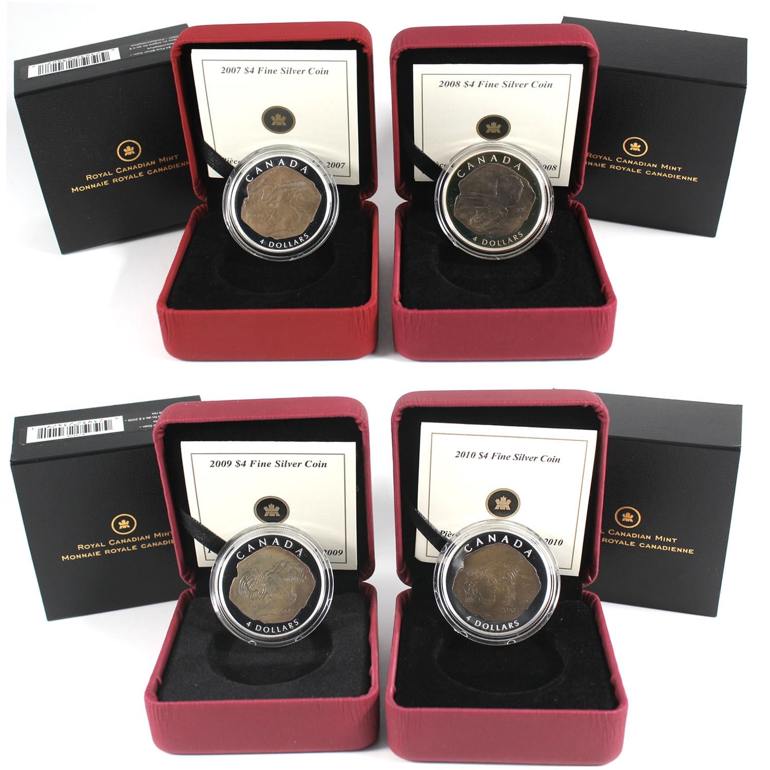 2007-2010 Canada $4 Dinosaur series Fine Silver Coins (toned). Lot includes: 2007 Parasaurolophus, 2008 Triceratops, 2009 Tyrannosaurus rex, & 2010 Euoplocephalus (Tax Exempt) 4pcs