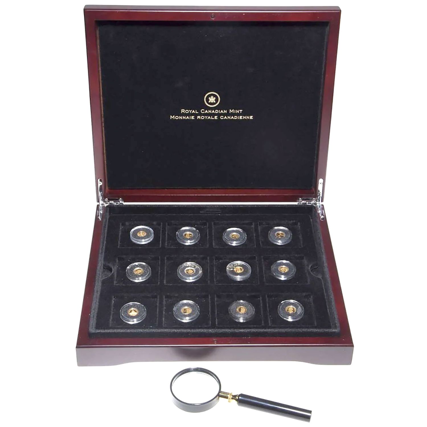 Each coin 0.5g Fine Gold. INCLUDES: Andorra 1 Dinar St. Peter's Basilica, Republic of Benin 1500 Francs The Thinker, Samoa $1 Marie Curie, Cook Islands $5 The Man With The Gold Helmet, Cook Islands $5 Orpheus, Samoa $1 St. Mark's Basilica, Samoa $1 Pallas Athene, Andorra 1 Dinar Joan Of Arc, Samoa $5 Moon Landing, Republic of Vanuatu 20 Vatu Eiffel Tower, Vanuatu 20 Vatu Vitruvian Man & Solomon Islands $5 SBD Nefertiti. Housed in wooden display case with magnifying glass & COAs. Collection's edition number is 0100. Display case has residue; capsules may be scuffed; outer box has writing. (Tax Exempt)