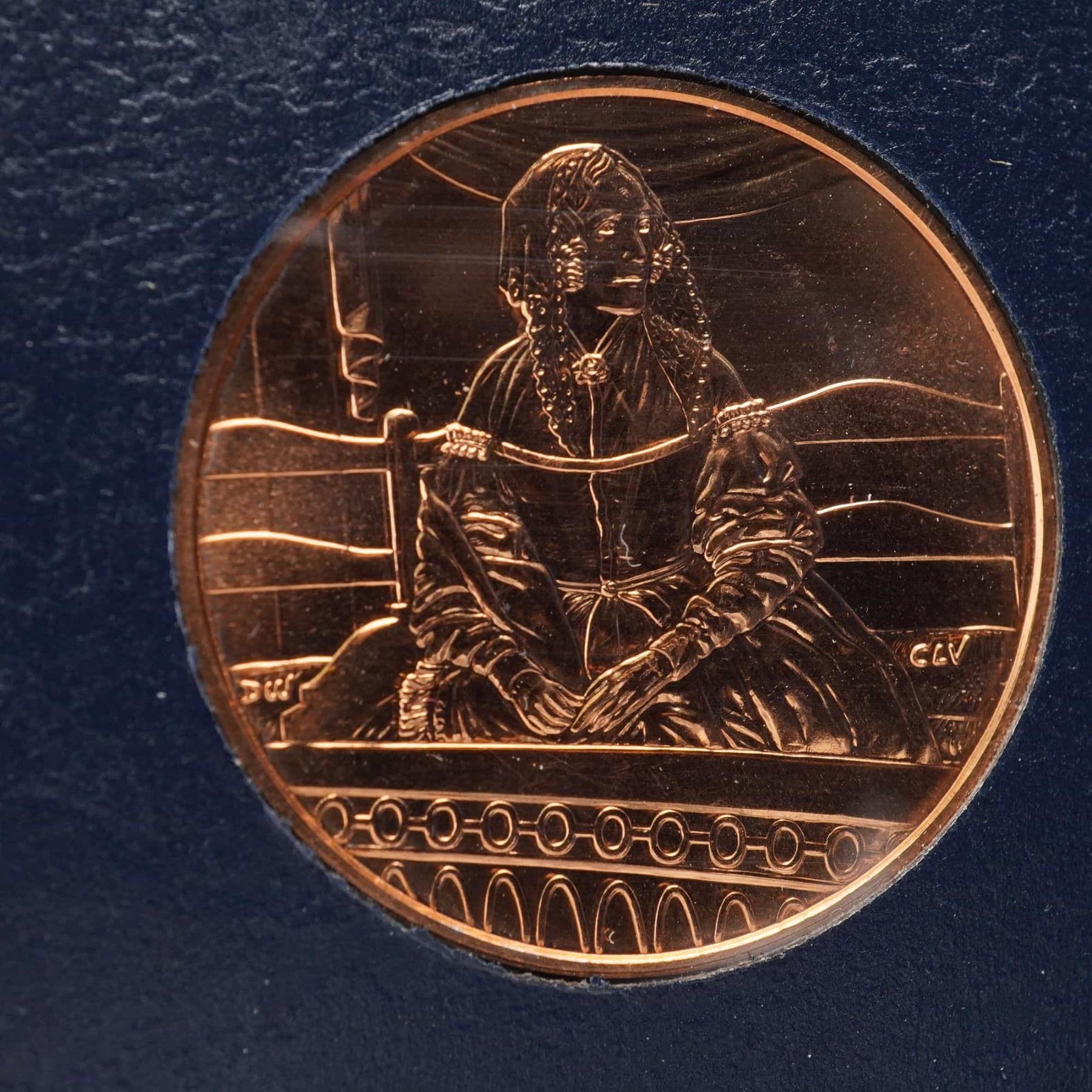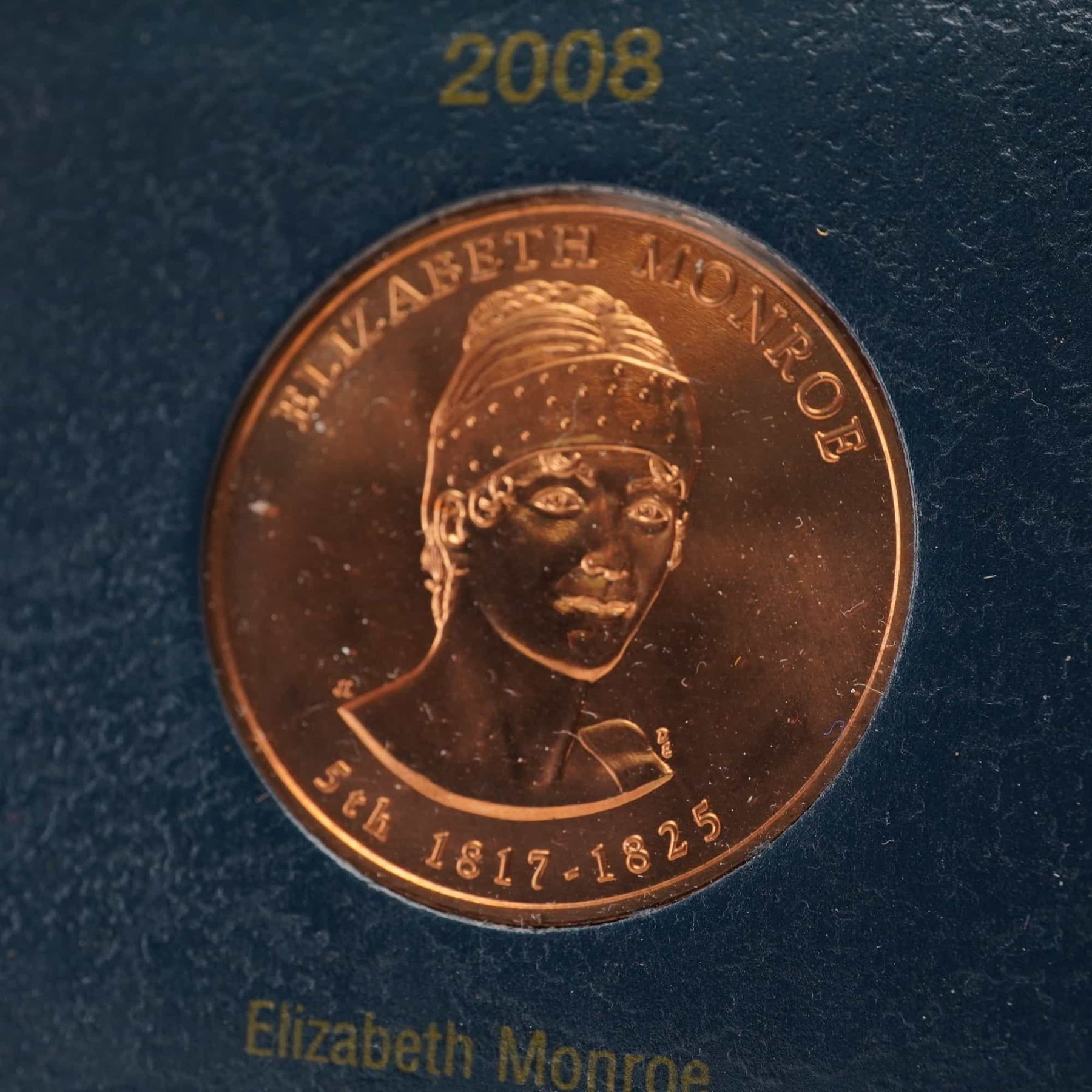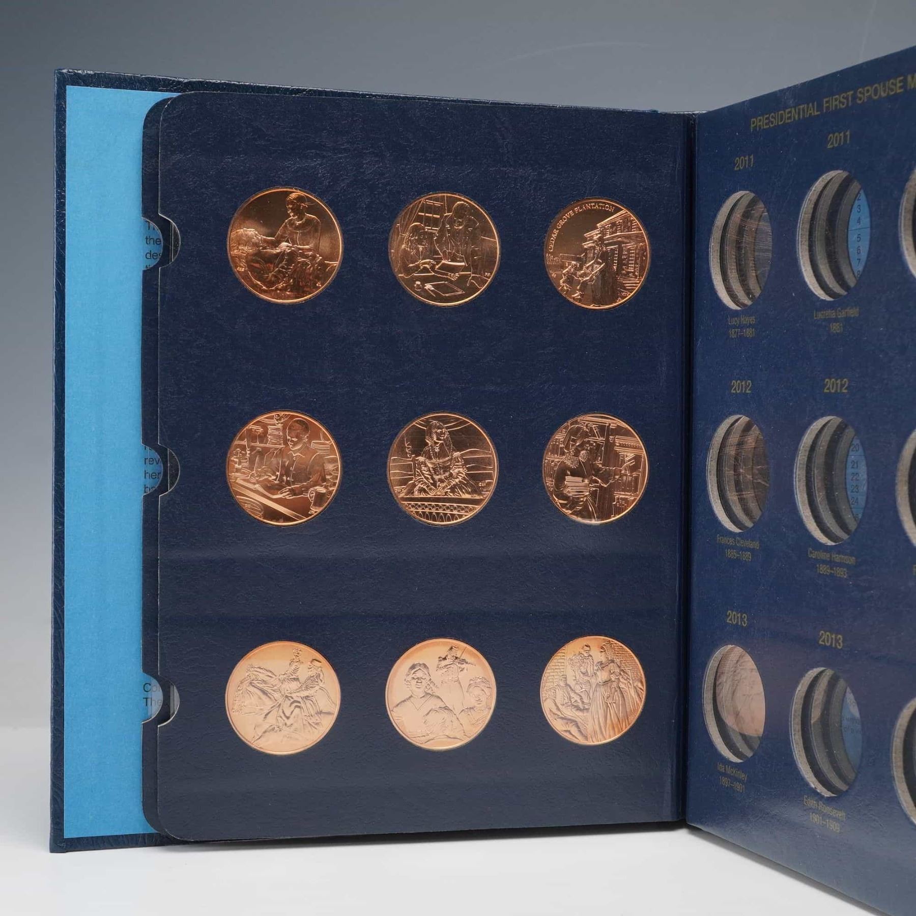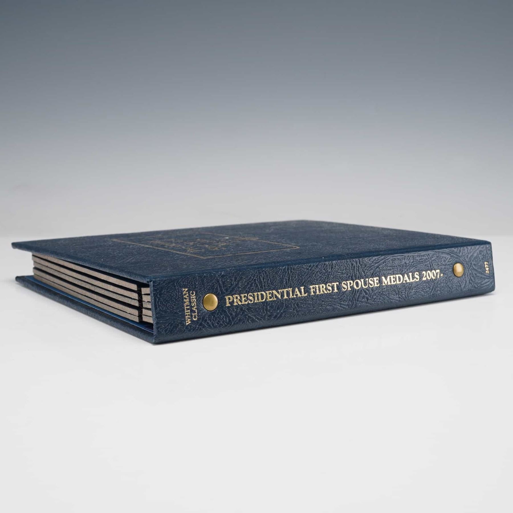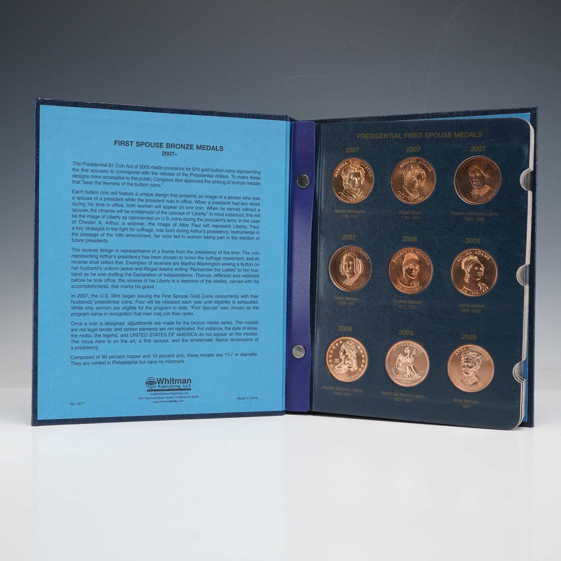 Blue Whitman collector album titled Presidential First Spouse Medals 2007 - containing a selection of bronze medals from the U.S. Mint's First Spouse Bronze Medal Series. These medals commemorate the First Ladies of the United States, issued alongside the Presidential $1 Coin Program beginning in 2007. Each medal features a portrait of a First Lady on the obverse with inscriptions including her name and years of service, while the reverse depicts themes symbolic of her life and contributions during her husband's presidency, accompanied by inscriptions UNITED STATES OF AMERICA and E PLURIBUS UNUM. The included medals range from 2007 through 2016, with examples such as Martha Washington, Abigail Adams, Dolley Madison, Elizabeth Monroe, and others. Each piece measures 1 5/16 inches in diameter and is composed of 90% copper and 10% zinc. The medals are housed securely within designated slots in the album's pages, which also contain printed biographical details and issuance years. This album is incomplete, with several empty spaces for missing medals from later years. The included medals retain their original luster with light handling marks visible on some surfaces. Album and medals in very good overall condition; partial set with some missing medals and light handling wear to album covers.
