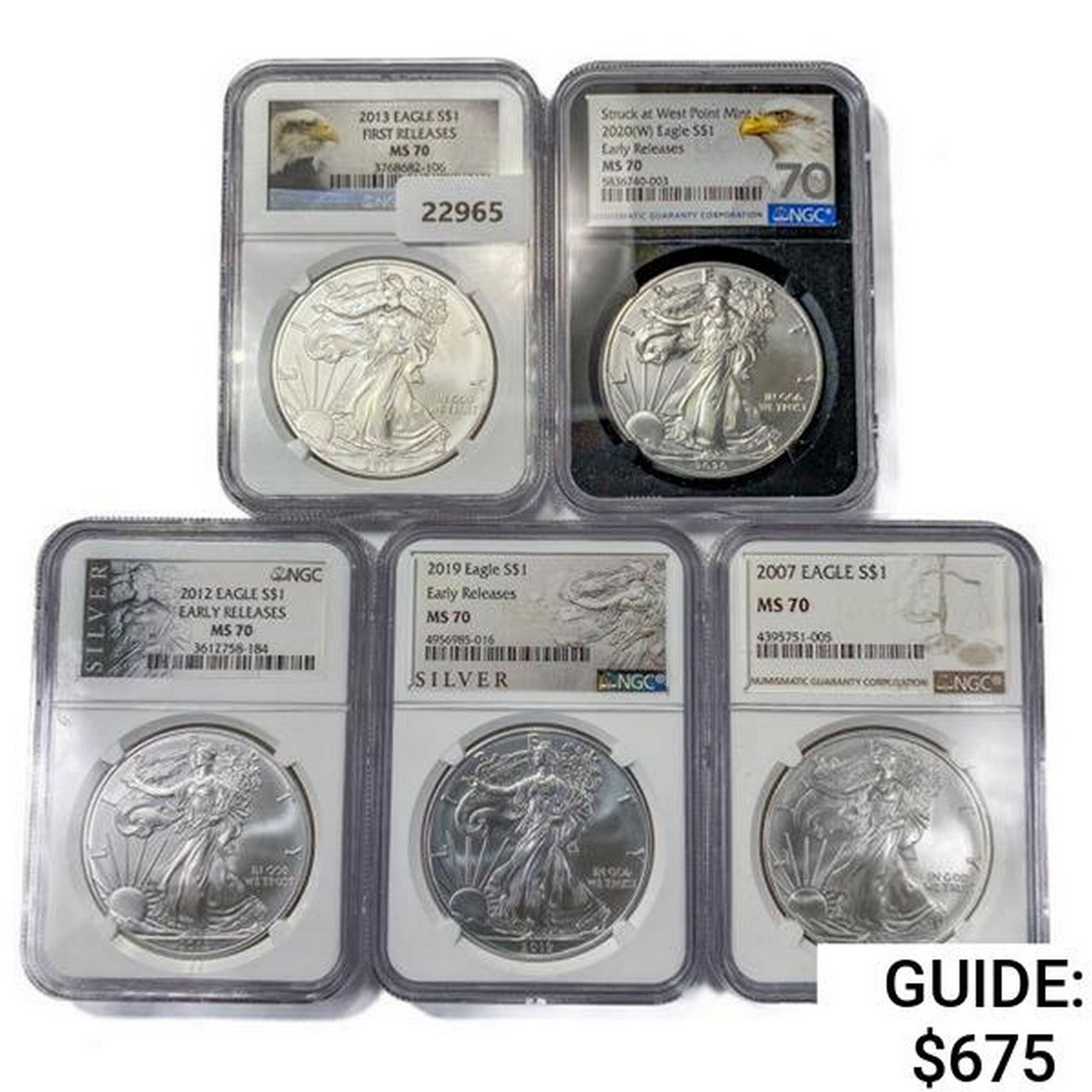 2007-2020 Set [5] American Silver Eagles NGC MS70