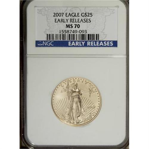 <B>2007 $25 Half-Ounce Gold Eagle MS70 NGC.</B></I> Early Releases. NGC Census: (0/0). PCGS Population (2/0). (#146918)<BR><BR><b>Shipping:</b> Coins & Currency (<a target="_blank" href="http://www.heritageauctions.com/common/shipping.php">view shipping information</a>)