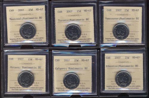 2007 25¢ Hockey Set ICCS MS67 Numismatic BU, Lot of 6 coins all depicting different Hockey logos.
