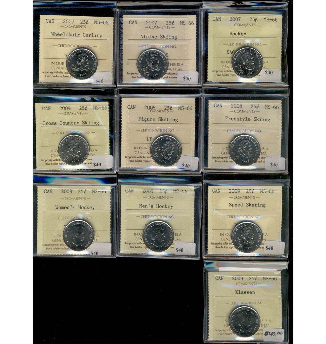 2007 25¢, Hockey, Skiing, Wheelchair, 2008 Skiing, Figure Skating, 2009 Cross Country, Speed skating, Men's Hockey, Women's Hockey & Klassen all ICCS MS66. Lot of 10 pcs.