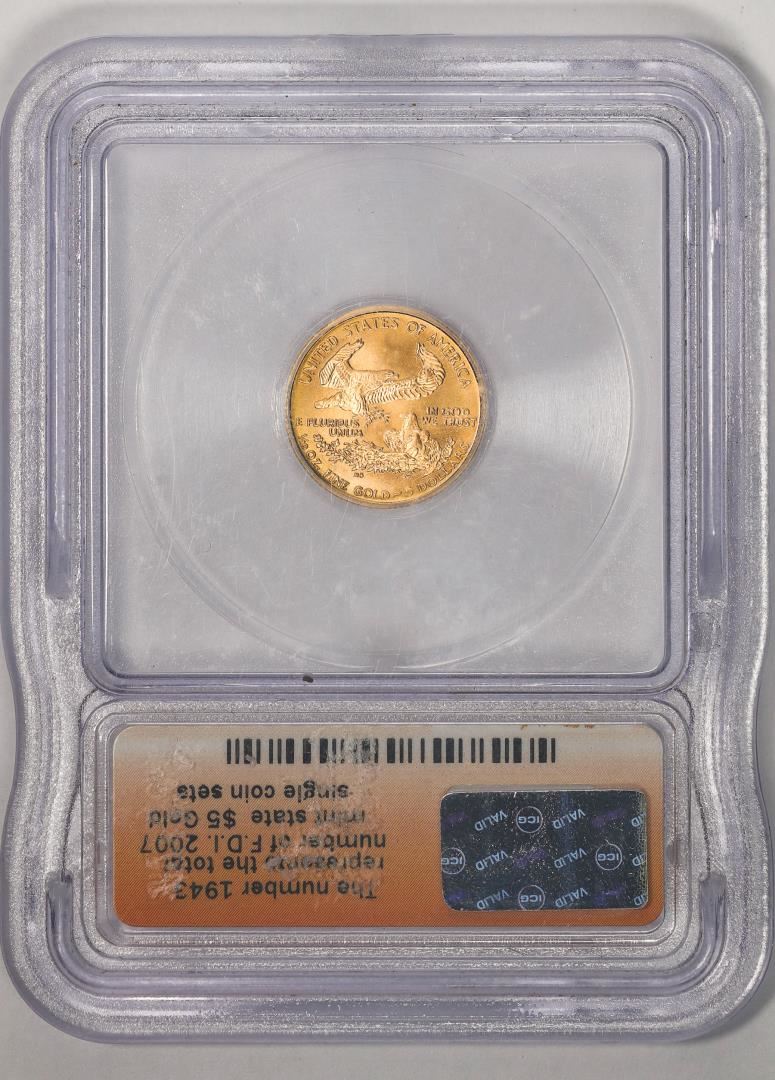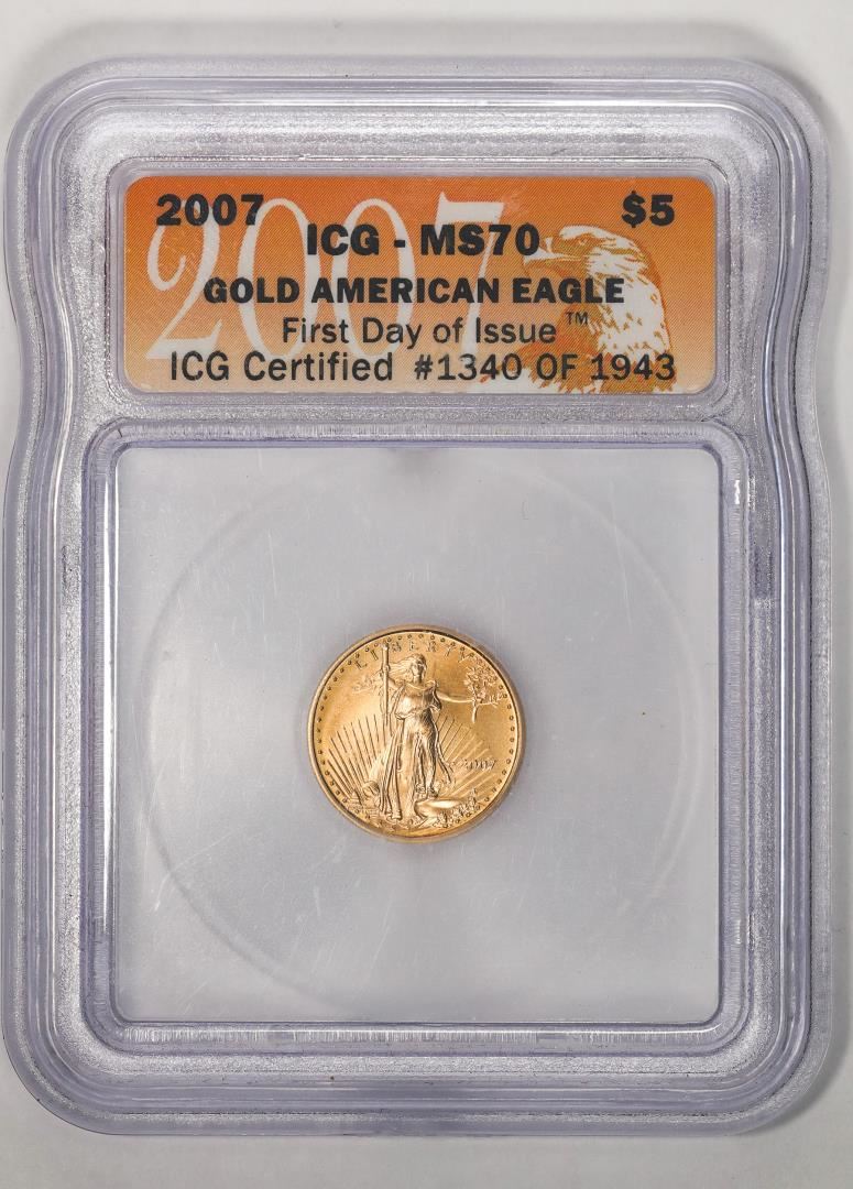 One 2007 $5 American Gold Eagle Coin ICG MS70 First Day of Issue. ICG Certified.