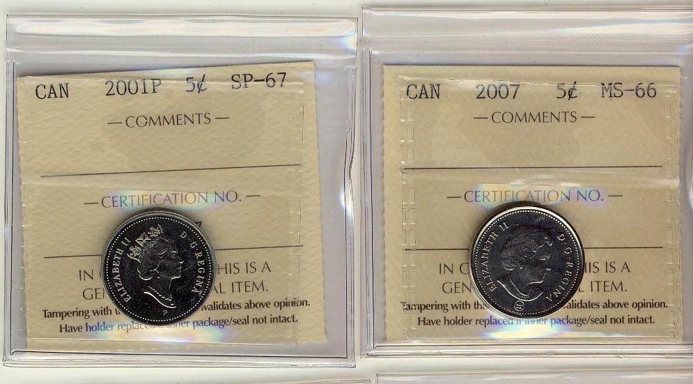 2007 5¢ ICCS MS66 and 2001P 5¢ ICCS SP67,