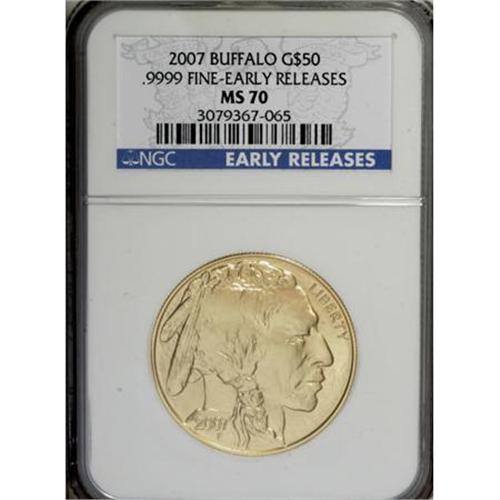 <B>2007 $50 Buffalo MS70 NGC.</B></I> .9999 Fine Early Releases. NGC Census: (0/0). PCGS Population (843/0). (#149122)<BR><BR><b>Shipping:</b> Coins & Currency (<a target="_blank" href="http://www.heritageauctions.com/common/shipping.php">view shipping information</a>)